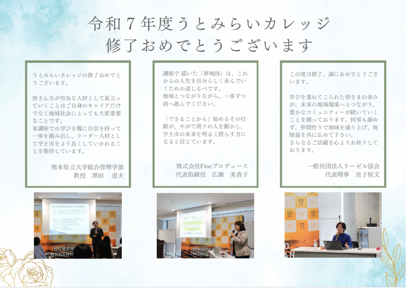 令和7年10月から12月にかけ「うとみらいカレッジ」を開催し、第1期カレッジ生として15名の修了者を送り出すことができました。
