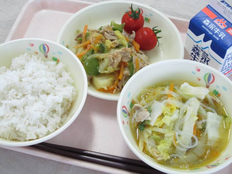 今月のうとんうまかデー第2回目は「キャベツ」です。前回のレタスに引き続き、網津地区の平尾さんご夫妻が心を込めて作られています。先日使用したレタスと違い、外で栽培されているので、天気の影響をそのまま受けるため、大雨や台風が来ないことを心配したり、鳥や虫が寄り付かないようにいろいろな工夫をされたりしています。海風をいっぱいに受けたキャベツは、ミネラル豊富でとてもおいしくなるそうです。今日は、豚肉と宇土産ピーマン(生産者:宮本さん)と一緒に、みそバターで炒めています。宇土のおいしい野菜を味わってくださいね。今日はミニトマト(生産者:平野さん)も宇土産で、宇土づくしのメニューになりました。