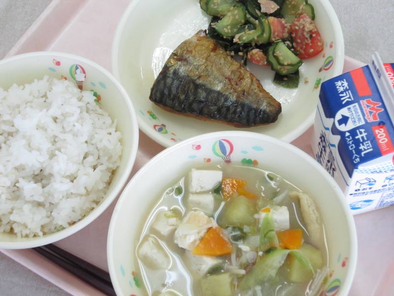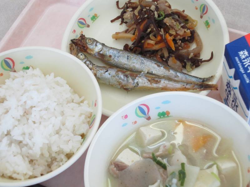 今日は、「まごわやさしい」和食の献立です。「まごわやさしい」という言葉は、「ま」は豆類、「ご」はごまなどの種実類、「わ」はわかめなどの海藻類、「や」は野菜、「さ」は魚、「し」はしいたけなどのきのこ類、「い」はいも類を表しています。「まごわやさしい」の食材を意識することは、健康的な栄養バランスの整った食事につながります。お家の食事でも「まごわやさしい」の食べ物を意識して食べてみましょう。