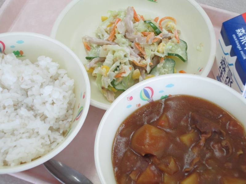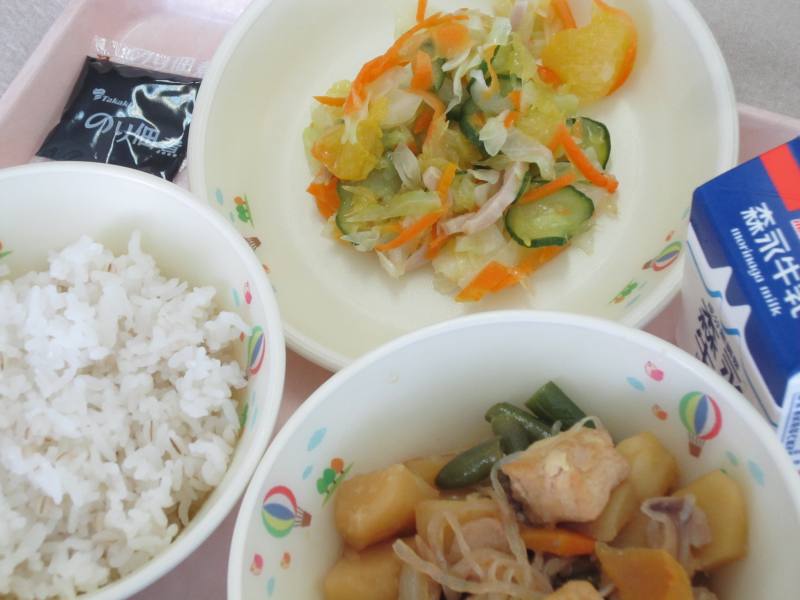 今日のピリ辛豚じゃがには、214kgのじゃがいもを使いました。じゃがいも1個の重さがだいたい200gだとすると、1070個程度のじゃがいもを使ったことになります。いつもの調理より量がとても多かったのですが、おいしい給食のために調理員さんたちが頑張って皮をむいたり洗ったりしてくれました。じゃがいもの種類には加熱するとホクホクの食感になる男爵(だんしゃく)と、粘りがあって煮崩れしにくいメークインがありますが、給食ではメークインを主に使っています。じゃがいもにはビタミンCが多く含まれていて加熱しても栄養素が失われにくく、たくさんの効果で私たちの健康をサポートしてくれる良い食材ですので、おいしくいただきましょう。