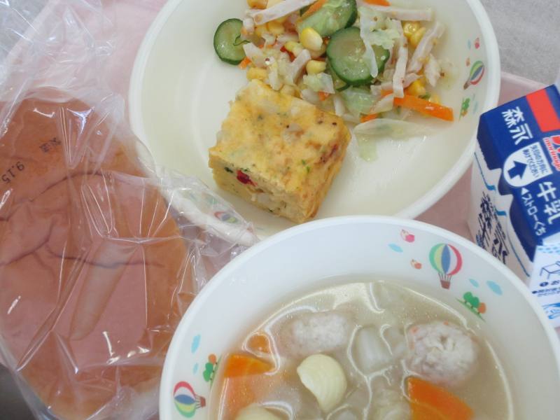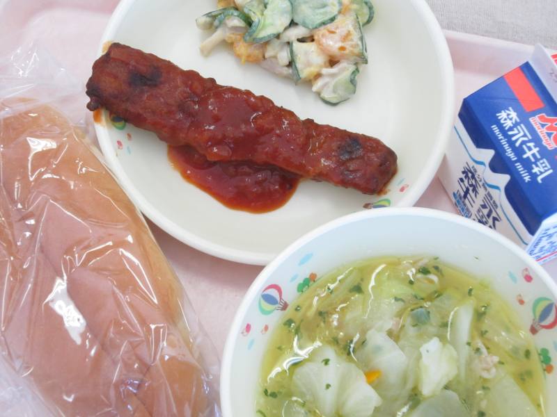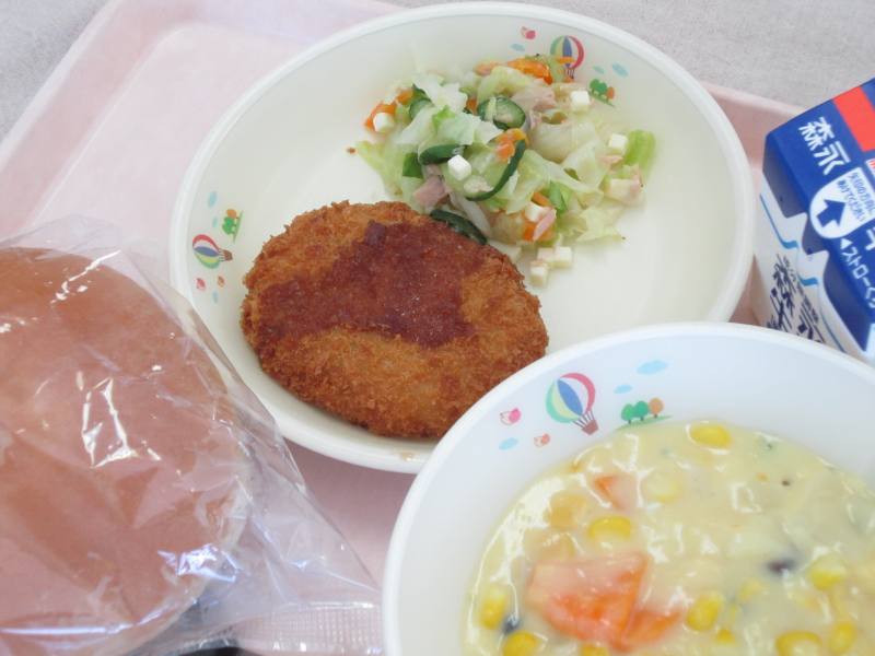 今日はリクエスト給食による献立です。網田中学校の生徒さんが主食にパンを選び、皆さんが好きなコーンスープやコロッケ、チーズの入ったサラダを献立に選んでくれました。今日のパンは、コロッケやサラダをはさんで食べられるようにカットしてあります。ところでみなさんは、食事の前に石けん等を使って手を洗っていますか?手には見えないバイ菌がたくさんついていて、さっと水で洗い流すだけではバイ菌を増やすこともあるそうです。特にパンの日は手で食べ物を触ることが多いので、風邪や食中毒の予防のためにも、石けん等を使った手洗いを徹底しましょう。