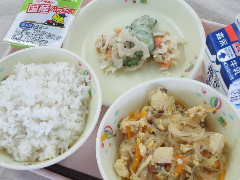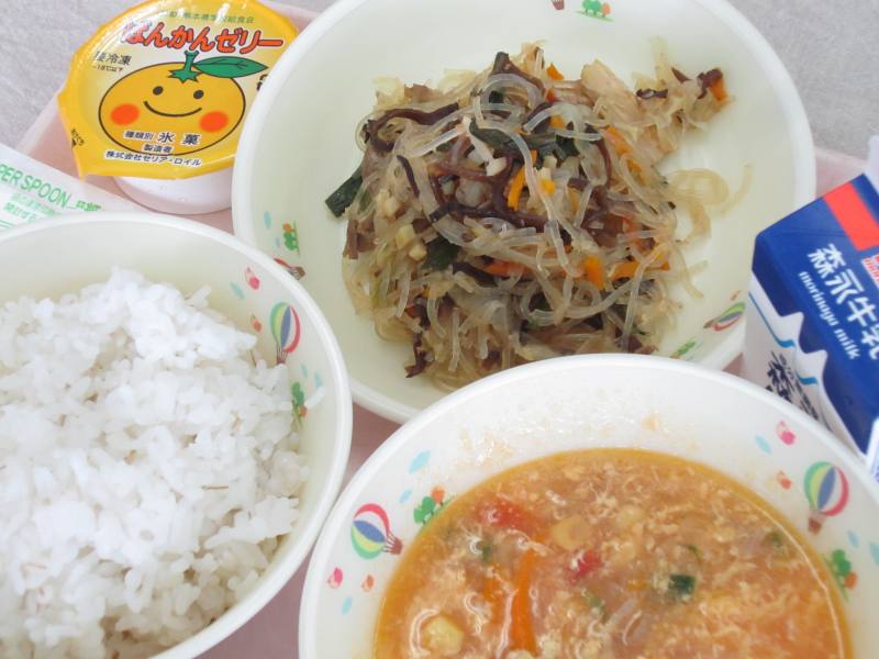 今日のチャプチェは、細切りにした牛肉や野菜などを炒めて春雨を混ぜ合わせた韓国の伝統的な料理です。ごま油の香ばしさと甘辛い味付けで、とても食欲がそそられる一品です。また、今日はデザートにばんかんゼリーを用意しました。ばんかんは、見た目やその大きさから和製グレープフルーツとも呼ばれています。味はグレープフルーツに比べて苦みが少なく、さっぱりとした甘みとさわやかな味わいが特徴です。今が旬の果物ではありませんが、残暑が厳しいこの時期は、さっぱりとした風味のゼリーがとてもおいしいので、味わって食べてくれるとうれしく思います。