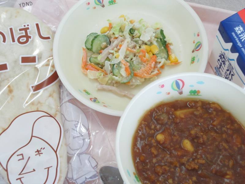 今日は、久しぶりにナンを給食に出しました。ナンは、インドをはじめとする中央アジアで広く食べられている平たいパンです。小麦粉・塩・水などの材料をこねて発酵させた生地を薄く伸ばし、タンドールと呼ばれる壺の形をした窯の内側にはりつけて焼いて作ります。また、今日のカレーは、ナンをつけて食べられるようにキーマカレーにしました。”キーマ”という言葉は、細切りにした肉やひき肉を意味しています。初めての人もいるかもしれませんが、ナンを食べやすい大きさにちぎって、キーマカレーにつけて食べてみてくださいね。