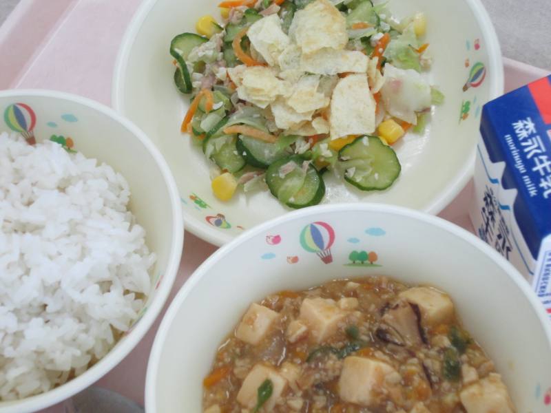 マーボー豆腐は中国の四川料理の一つで、ひき肉、豆腐、ねぎなどの食材を豆板醤などを使って炒め煮して作ります。マーボー豆腐は柔らかな口あたりでサラサラと食べやすい料理なので、よく噛んで食べてもらうためのもう一品として、サラダに噛み応えのあるカシューナッツを使いました。よく噛むことはあごを丈夫にするだけでなく、頭の働きを活発にして食べ過ぎやむし歯の予防をするなど、たくさんの良い効果があります。今日から一口30回を目安にして、よく噛むことを意識しながら食べてみましょう。