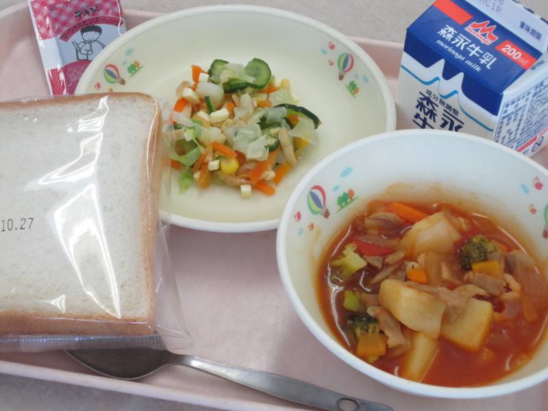 10月10日は「目の愛護デー」です。今日は目によい食材として、レバーとほうれん草を使いました。レバーには、ビタミンAがたっぷり含まれています。また、ほうれん草やかぼちゃ、にんじんなどの色の濃い野菜にはβ-カロテンが多く、体内でビタミンAに変わって乾燥や感染症を予防してくれるはたらきがあります。その他の食材には、ブルーベリーやなす、むらさきいもなどがあり、これらにはアントシアニンが多く、目の疲れをとってくれるはたらきがあるので、目を大切にするために積極的にとるようにしたいですね。