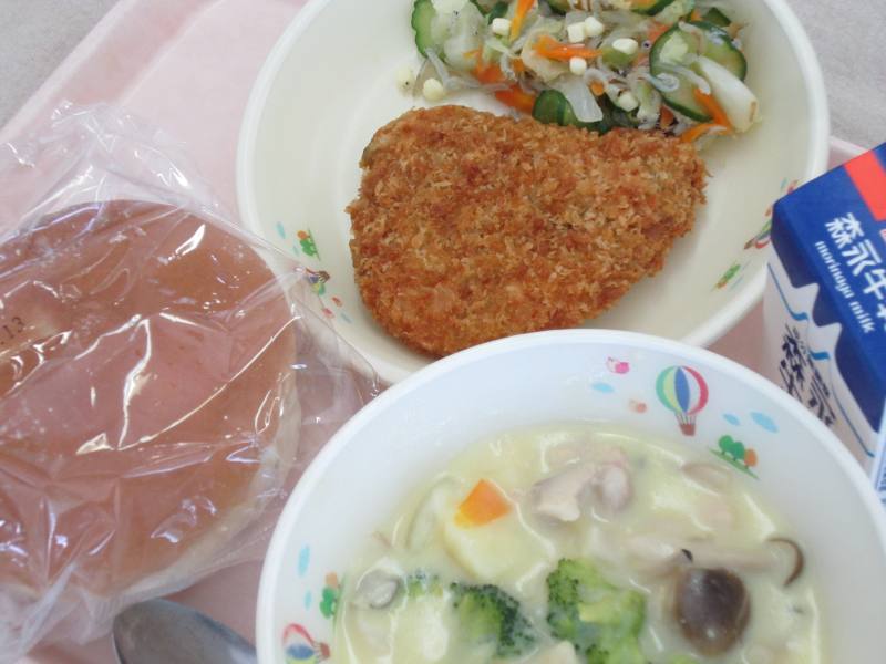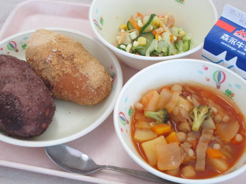 今日のチリトマトスープには、大麦を平たくつぶした押麦(いつも麦ごはんに使っているものと同じ品種 )を入れました。麦には食物繊維がたっぷり含まれており、おなかの調子を整える不溶性食物繊維と、腸内の善玉菌を増やして腸内環境を整える水溶性食物繊維がありますが、大麦にはどちらもバランスよく含まれています。また、10月から12月にかけて毎年恒例の揚げパンを3回に分けて提供する予定です。今日は、中学校だけ特別に2種類の味の揚げパンを作りましたので、定番のきなことほろ苦いココアの味を食べ比べて楽しんでくださいね。