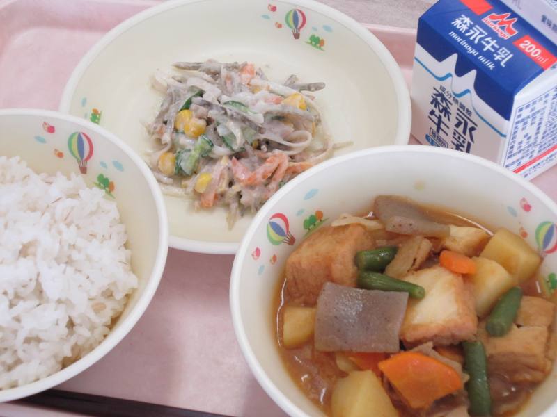 今日の中華風豚じゃがは赤みそやトウバンジャン、さらににんにくを使い、ごはんが進むピリッと辛い味付けにしました。トウバンジャンの主な原料である唐辛子にはカプサイシンという辛味成分が含まれていますが、汗をかきやすくする効果や脂肪を燃えやすくする効果、そして食欲をアップさせる効果があり、辛さが定評のキムチやタバスコにも同じ成分が含まれています。また、クイッティオはタイの米粉を使った麺ですが、今日はごぼうなどと一緒にマヨネーズで和えてサラダにしましたので、もちもちとした独特の食感を楽しんでくださいね。