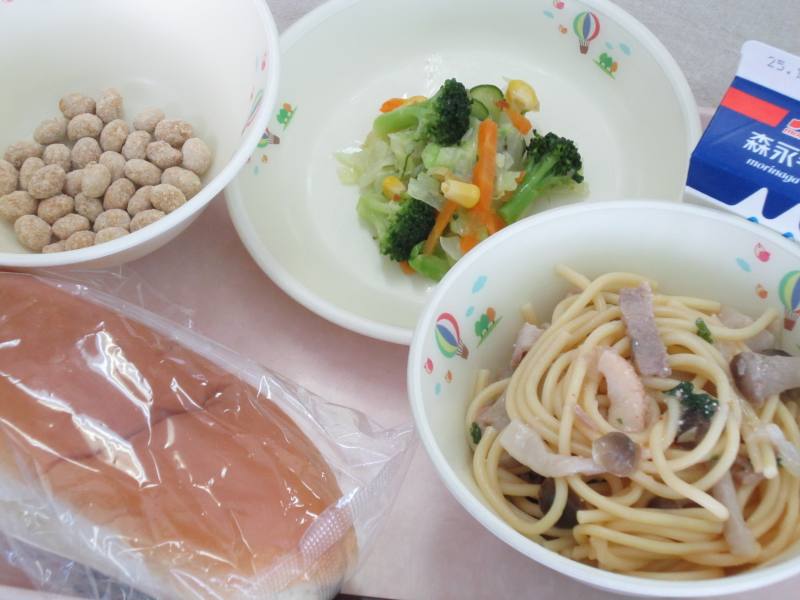 今日は、たらこスパゲティが給食に初登場です。たらこはスケトウダラの卵を塩漬けにしたもので、明太子はそれに唐辛子を入れてぴりっと辛くさせたものです。たらこはぷちぷちとした食感がおいしく、ベーコンやいかと組み合わせてうまみたっぷりのスパゲティに仕上げました。きなこビーンズは、煮溶かした砂糖に煎り大豆を入れて上からきなこと粉糖を振りかけて作りますが、不足しがちな大豆をおやつ感覚で食べることができる一品です。次回の給食だよりではココアビーンズの作り方を紹介しているので、おうちでも作ってみてくださいね。