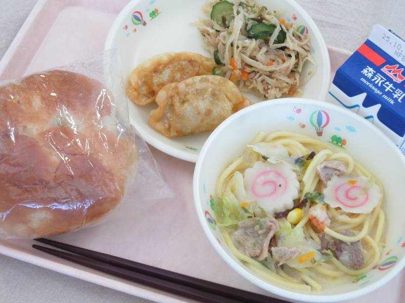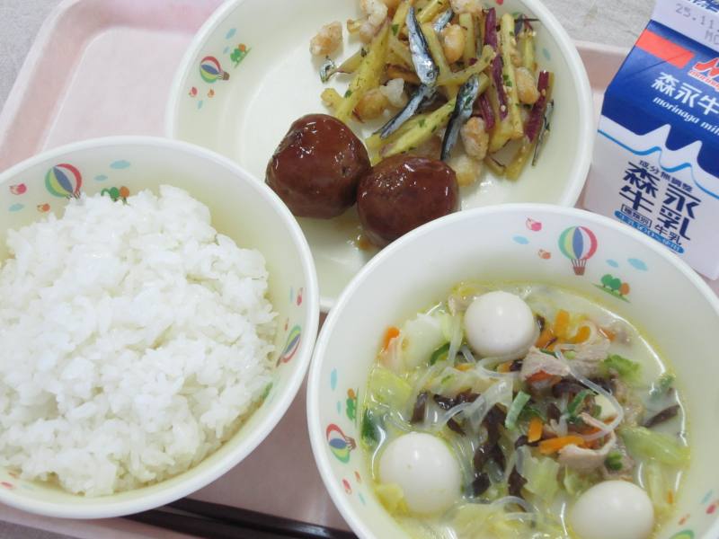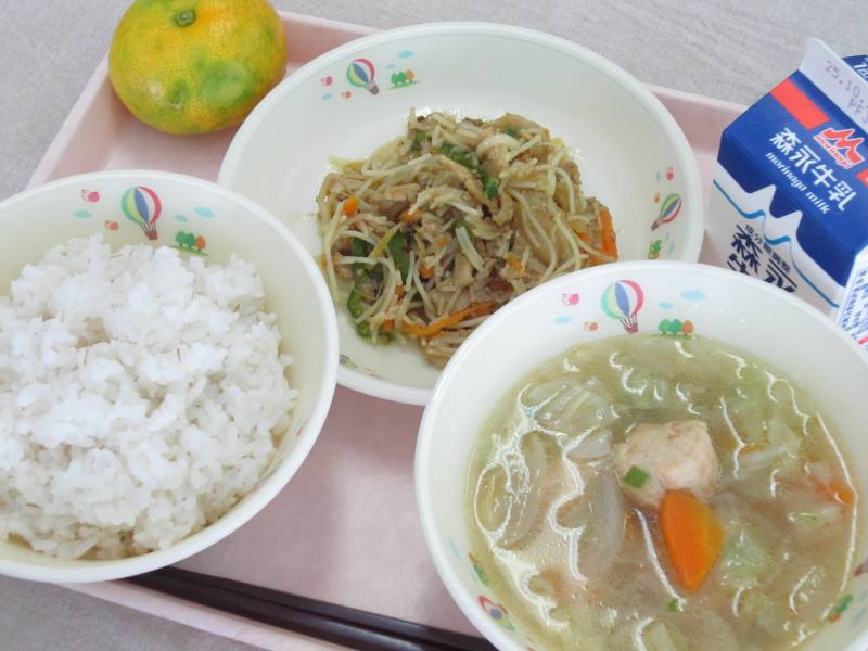 今日は、ちゃんぽんを作りました。給食では作ってから食べるまで時間がかかるので、麺料理は伸びてしまうことがよくあります。給食で使っている焼きそばやちゃんぽんなどの中華麺は特に伸びやすいので、おうちで食べる麺料理と違った印象を受けることも多いと思います。そこで今日は、ちゃんぽん麺の代わりに固ゆでしたスパゲティを使ってみました。豚肉やなるとをはじめとして、いろいろな野菜を多めに入れて具だくさんに仕上げましたので、麺のつるつるとした食感を味わって食べてくださいね。