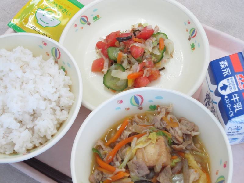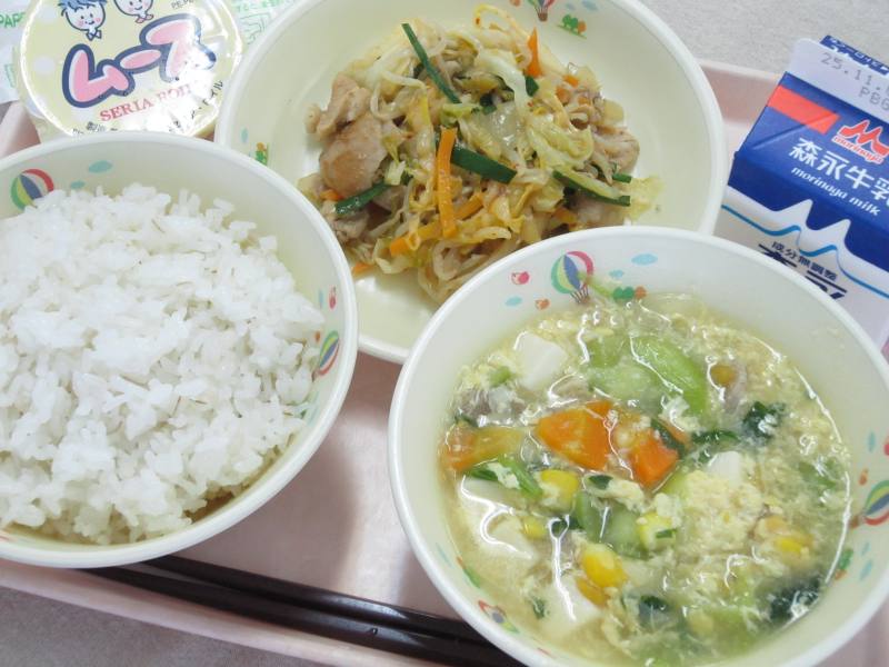 今日の献立は、網田小学校のリクエスト給食です。ふわふわの卵スープとピリッと辛い豚キムチ、それに人気のムースを組み合わせてくれました。豚キムチはピリ辛の味付けが食欲を増進させてくれますが、給食では仕上げにオイスターソースを入れてコクを出しています。豚肉に含まれているビタミンB1は疲労回復に役立つ栄養素ですが、夏から秋への季節の変わり目は残暑の疲れが出て体調を崩しやすくなるので、給食をしっかり食べて元気に過ごしてもらえたらうれしく思います。