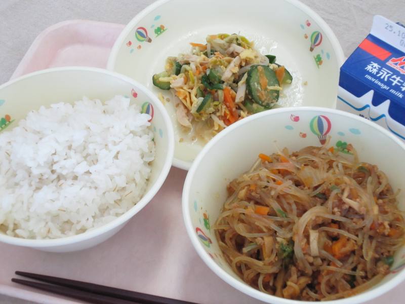 今日の主菜は、つるっとした食感がおいしいマーボー春雨です。赤味噌をベースに、テンメンジャンやコチュジャン、トウバンジャンを合わせて味付けしています。春雨は、でんぷんを原料にして作られる半透明な麺状の食品です。一般的にじゃがいもやさつまいものでんぷんを使って作られますが、宇土市の給食ではえんどう豆を原料とした春雨を使っており、じゃがいも等のでんぷんを原料にしたものよりコシが強めで透明感が高く、煮崩れしにくい特徴があります。スープや鍋物、炒め物、サラダにしてもおいしく食べることができますので、おうちでも試してみてくださいね。