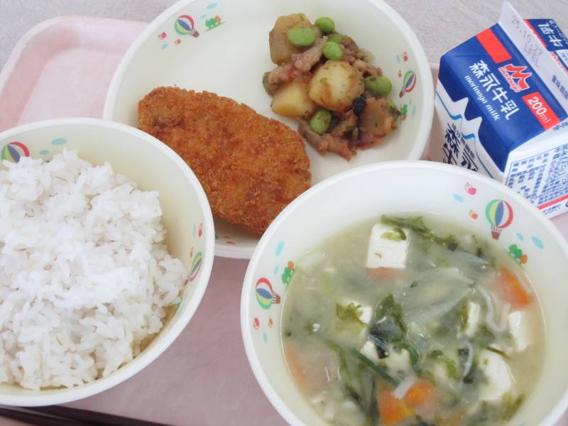 今月のふるさとくまさんデーで紹介するのは「天草地区」です。みそ汁は、あじといわしの混合削り節でだしをとったものに天草特産のあおさを入れて磯の香り豊かに仕上げ、天草市の牛深町や天草町でたくさん水揚げされているしいらはフライにしました。しいらの体色は黄色と青色が混ざったような鮮やかな色合いで、頭が丸い形をしているのが特徴です。日本では比較的安価な魚ですが、ハワイでは高級魚として食べられているそうです。また、天草市有明町の特産品であるたこは、じゃがいもと合わせてソースで炒め、たこ焼き風の味付けにしています。ふるさとくまさんデーの今日は、天草の味を存分に楽しんでくださいね。