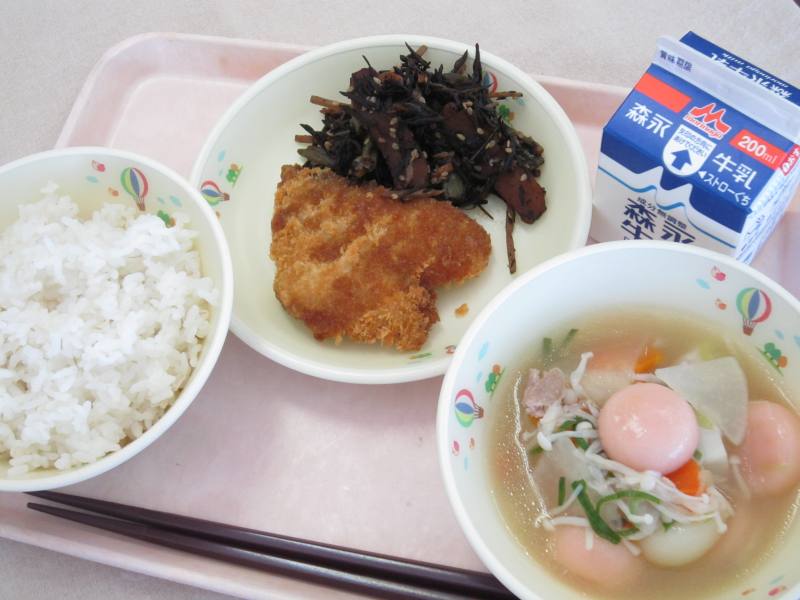 今日の給食は、鏡開きにちなんだ献立です。鏡開きは、お正月にお供えした鏡もちを下げ、家族の健康や1年の幸せを願って食べる行事です。今日は、赤と白のお餅を使った紅白雑煮を食べてもらうことでお正月の雰囲気を味わえるようにしました。また、魚のぶりは成長するにつれて名前が変わる「出世魚」と呼ばれ、昔から縁起の良い魚としてお正月やお祝いの席で食べられてきましたが、わたしたちの体を作るたんぱく質も多く含まれています。お正月の行事を思い浮かべながら、感謝の気持ちを持って残さずいただきましょう。
