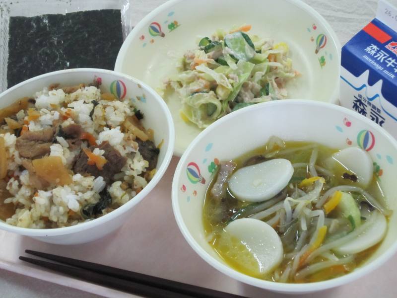 今日の給食は、今年は初となる宇土産焼きのりの登場です。令和2年から、住吉漁協と網田漁協より「宇土市の子どもたちに地元でとれたおいしいのりを食べてほしい」という思いから、給食用の1年分ののりを無償で提供いただいてます。今日は、そののりを使ってキンパという韓国の巻き寿司をイメージし、牛肉、にんじん、ほうれん草、たくあんを、コチュジャンなどのピリ辛の調味料で味付けしたものを作りましたので、ごはんに混ぜたり、ごはんの上に乗せたりして、お好みで焼きのりで包んでいただきましょう。