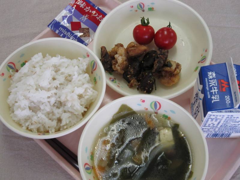 今日はふるさとくまさんデーです。今回は天草地区の食べ物を紹介します。天草地区は海に囲まれたたくさんの島があり、海産物が豊富です。まず、味噌汁の中に入っている海藻はわかめではなく、あおさです。あおさは、緑色がきれいで、磯の香りがします。また、今日の魚は牛深のいわしです。粉につけて揚げたいわしに、生姜を入れた甘辛ダレをかけてかば焼き風に仕上げました。天草の海の幸たっぷりの給食を味わいながら食べてほしいと思います。