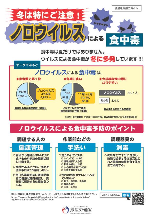 ノロウイルスによる感染性胃腸炎や食中毒は、一年を通して発生していますが、特に冬季に流行します。