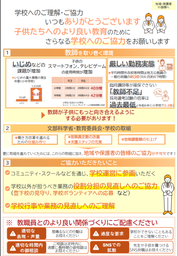 各学校と連携しながら、教育職員が働きやすい環境づくりと、持続可能な学校運営の実現に努めてまいります。