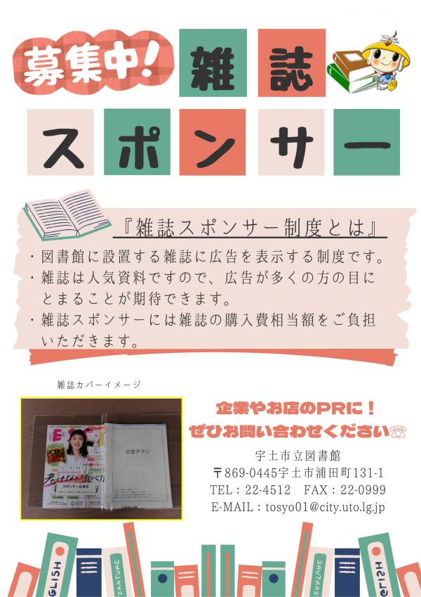 宇土市立図書館では、雑誌購入支援を通じて、図書館活動を支えていただく「雑誌スポンサー」を募集しています。