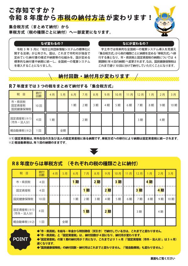 宇土市では、市・県民税、固定資産税、国民健康保険税について、3つの税を一つにまとめ年10回に分けて納付していただく「集合税方式」をとっていますが、令和3 年5 月に「地方公共団体情報システムの標準化に関する法律」が公布され、国は、これまで市町村が独自で定めていた納付書の様式や納期等の仕組みを、国が定める標準的な納付書や納期に統一し、全国統一の電算システムを導入することになりました。