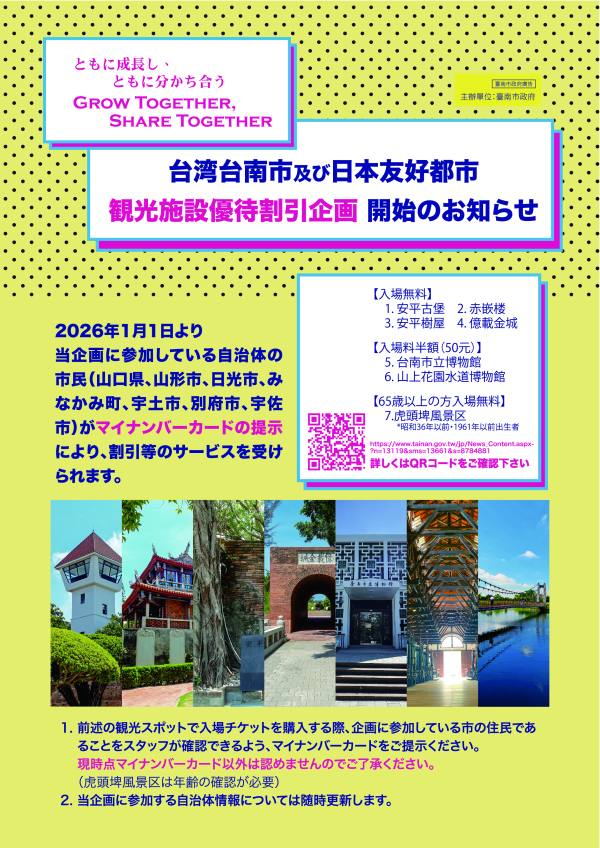 ご利用いただける対象施設、割引料金等は下記のとおりです。台湾への旅行の際には、友好交流都市である「台南市」にぜひお立ち寄りください。