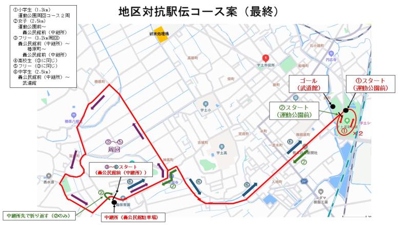 1月12日(月・祝)に開催される第51回宇土市地区対抗駅伝大会について、昨年度までの6区14.6kmのコースから図のとおり6区15.9kmのコースに変更します。