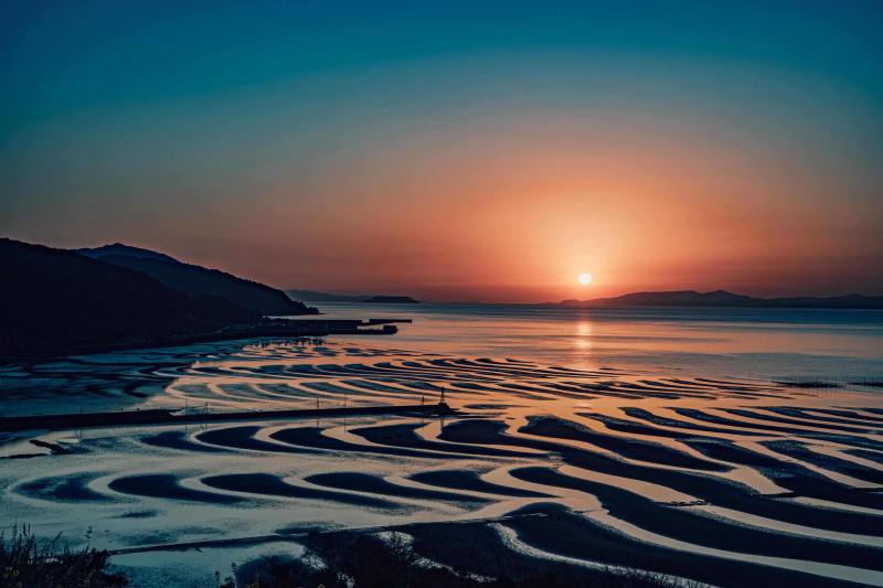 夕日が沈む時間、干潟の曲線に光が差し込み、自然が描いた一枚のアートのような景色に感動しました。