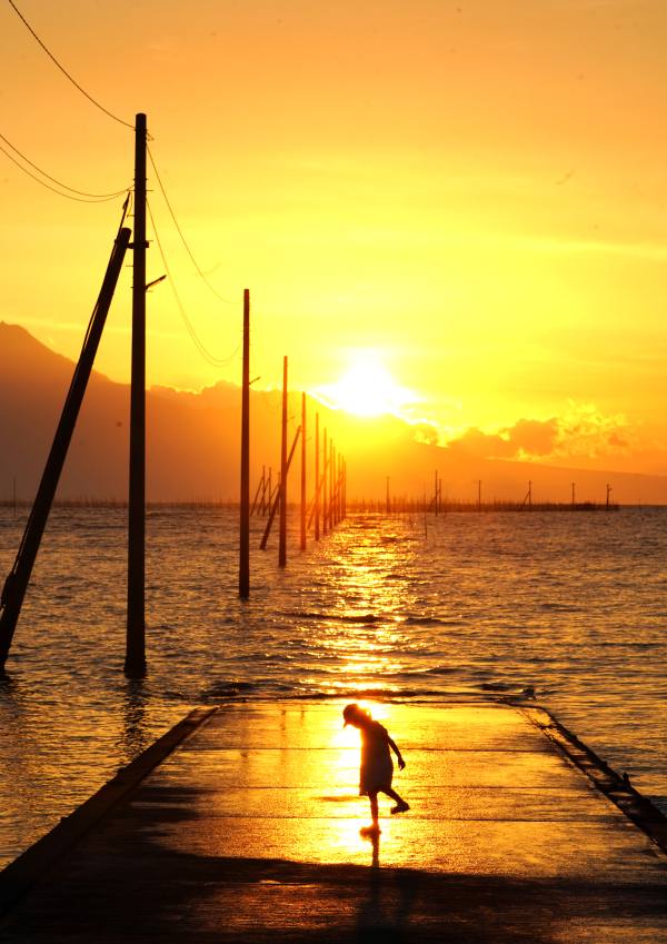 年に数日しか見れない長部田海床路の太陽の道(光)のなかで子供が楽しそうに遊んでいるところを撮影しました。