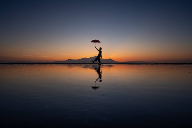 宇土の干潟で撮影しました。夕焼けと無風に近い環境が重ならないと撮れない、夕焼けリフレクション撮影です。これをいつも自撮りで行っております。