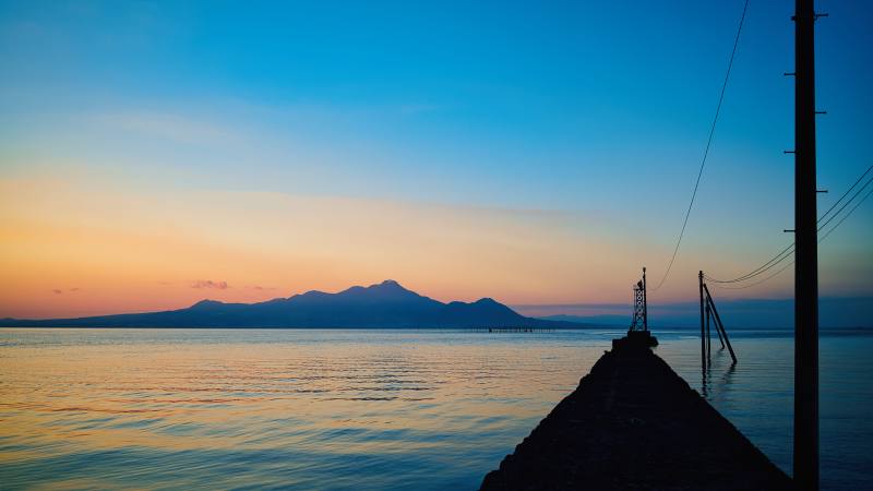 網田海岸から有明海を眺めると、夕暮れの海が穏やかに広がっていました。遠くには雲仙の山並みが静かに浮かび、海と空がゆっくり夜へ変わっていく時間でした。