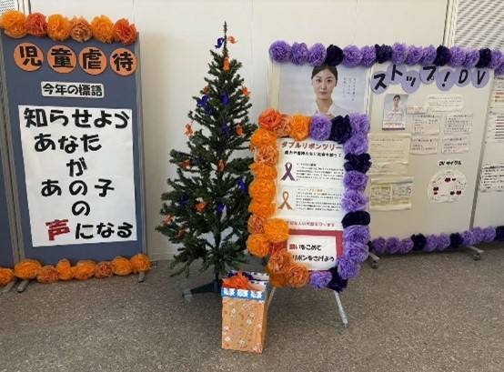 市民の皆様に11月の児童虐待防止&DV防止月間について知っていただけるよう市民交流スペースに、オレンジリボン(児童虐待防止)&パープルリボン(女性への暴力根絶)のツリーを展示しています。
