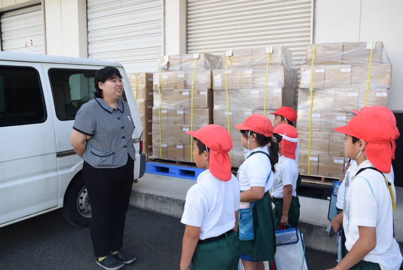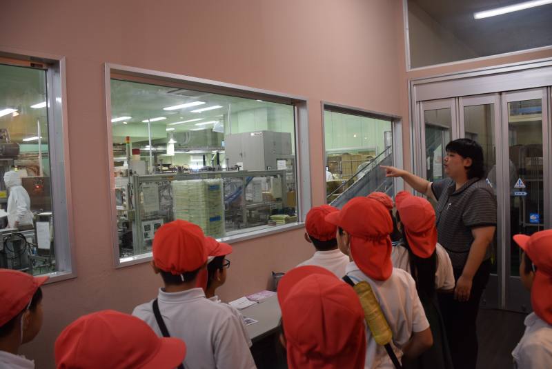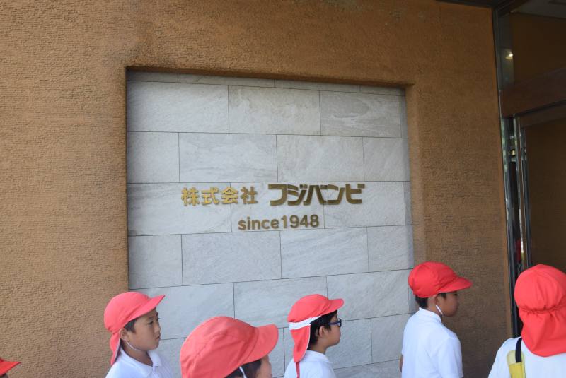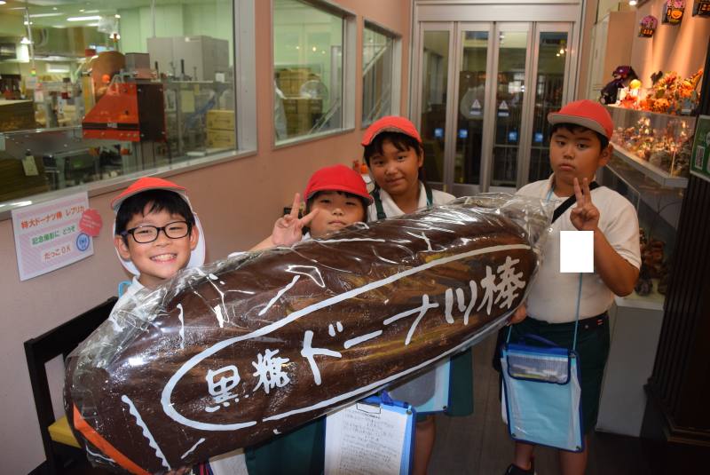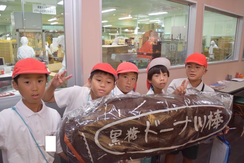 フジバンビでは黒糖ドーナツ棒を作っている過程を見学させてもらいました。どんどん商品が出来上がる様子を見て、子どもたちは目を輝かせていました。