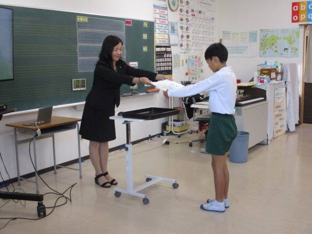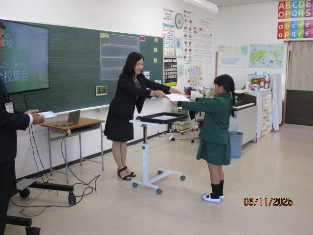 陸上や夏休みの作品の表彰があり、その後、校長先生からのお話がありました。