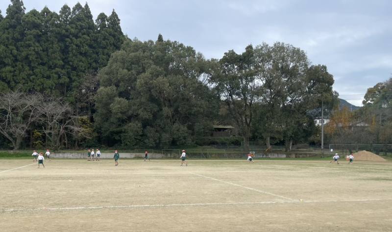 今回は運動場で「けいどろ」を行いました。最初は寒そうな子どもたちでしたが、外で走り回ると「暑い暑い!」と言って、上着を脱いで遊んでいました。