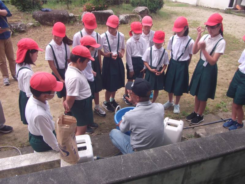 5/19(月)の2,3時間目に、中山康次郎さんをお招きして、よいお米を作るための「塩水選」がありました。地域の学校運営協議会委員の吉武さんと坂田さんも来てくださいました。