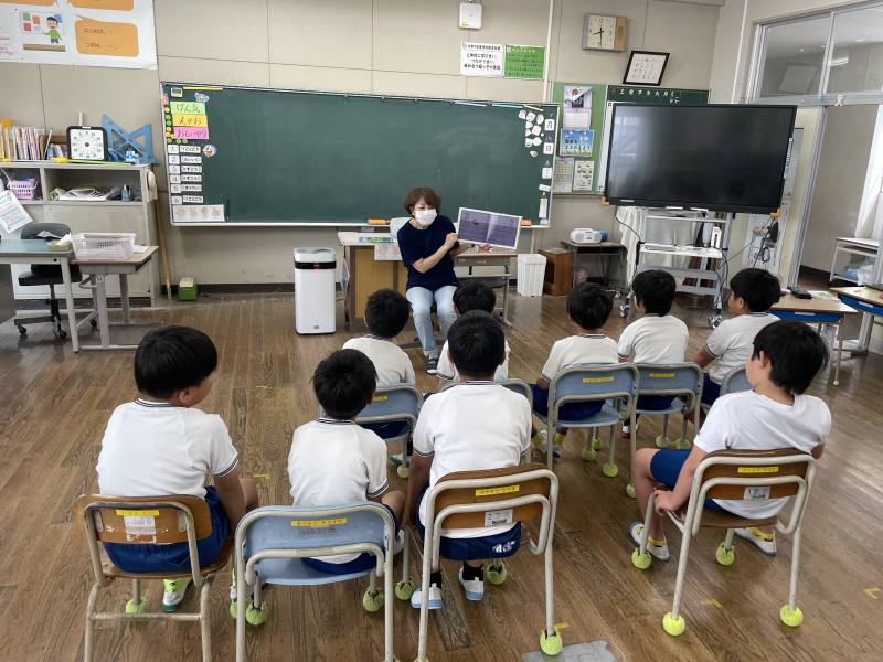 朝活動の時間に、地域の方々に来ていただいて、読み聞かせをしていただきました。