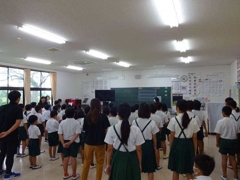 みんなで校歌や今月の歌を歌いました。笑顔で、体を曲に合わせて動かし、楽しみながら歌っていました。子どもたちの元気な歌声が学校中に響き渡る清々しい朝になりました。
