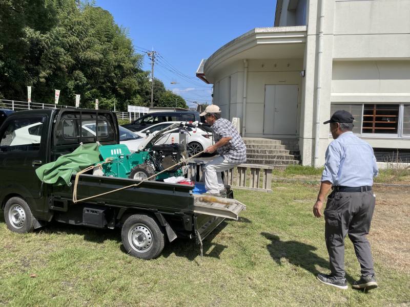 10/1(水)の午前に、学校運営協議会委員の松本幹夫さん、大久保生一さんのお二人が本校の運動場周りを整備してくださいました!大久保さんは上新開地区所有の大きな草刈り機を使い、運動場の草刈りをしてくださいました。松本さんは軽トラックで草刈り機を運搬した後、田んぼや芋畑周辺の整備をてくださいました。おかげで運動場周りがとてもきれいになりました。大久保さん、松本さん、上新開地区の皆様、ありがとうございました!