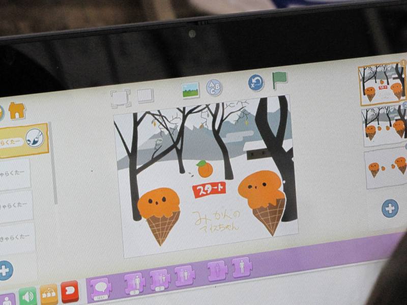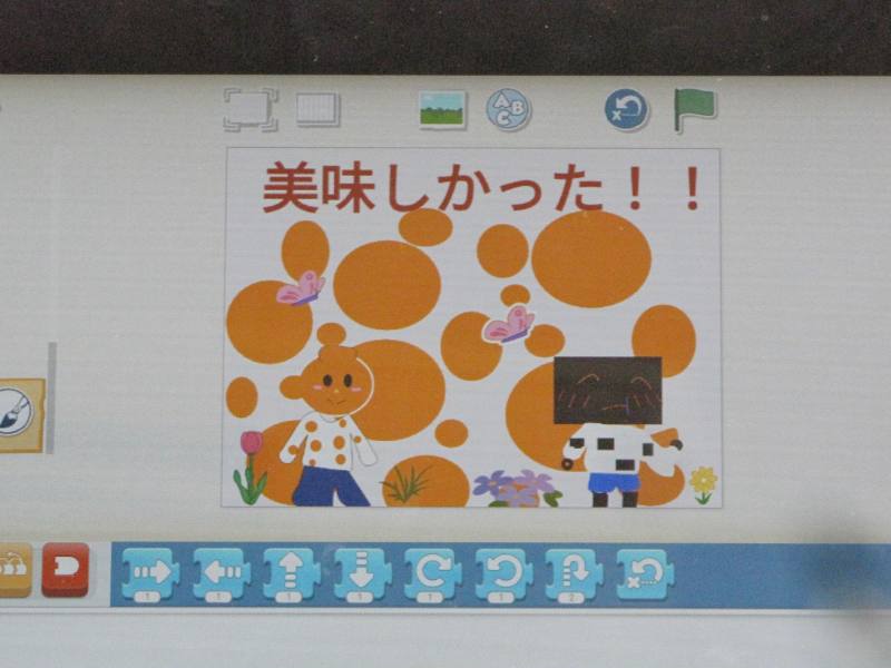 9回目の授業のテーマは「作品を作ろう!」です。8回目に続き網田の特産物を紹介するショートアニメーションをプログラミングで作成しました。