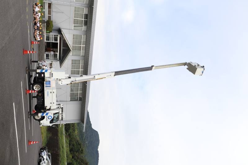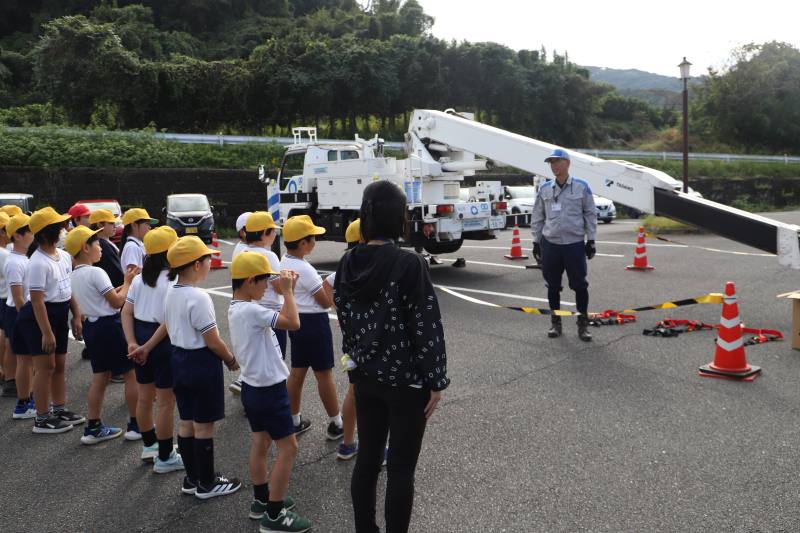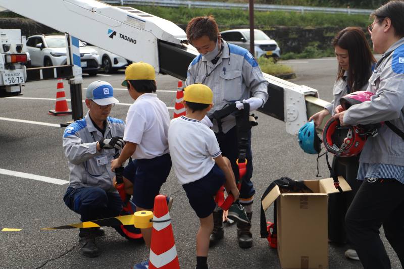 また、職業体験の一環として、同職員の皆様による高所作業車への搭乗体験やドローン飛行の見学も実施されました。普段触れることのない電力事業の仕事や、最新の技術について説明を受け、子どもたちは大変興味深く体験していました。
