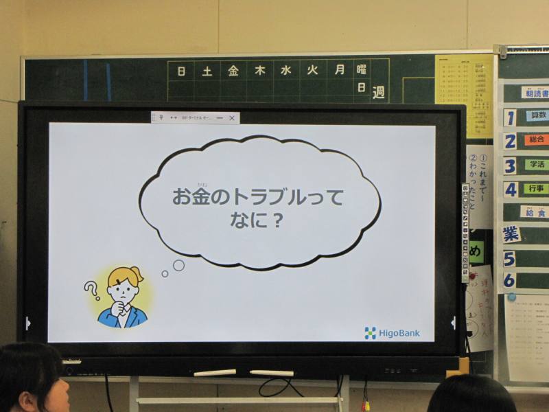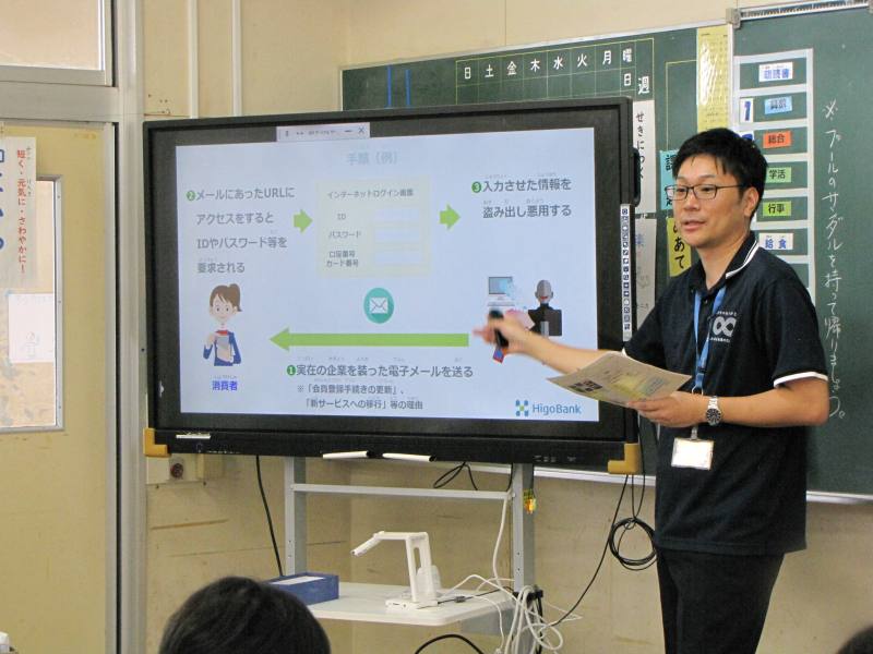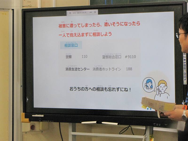 夏休みに入ることから「気を付けよう!お金のトラブル」というテーマで、インターネット上で事例が多い「ワンクリック詐欺」「フィッシング詐欺」「オンラインゲームトラブル」について、その概要と実際の画面が出てきたらどうするか対処方法をクイズ形式で学びました。