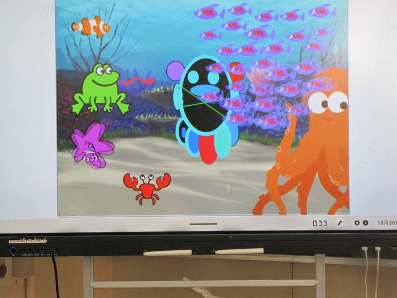 テーマは「海のアニメーションを作ろう」で4回シリーズの4回目。海を守るために大切なことをテーマに、今回は海の生き物を動かし画像効果などを学びました。