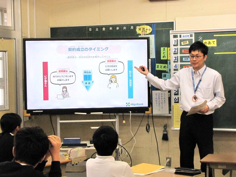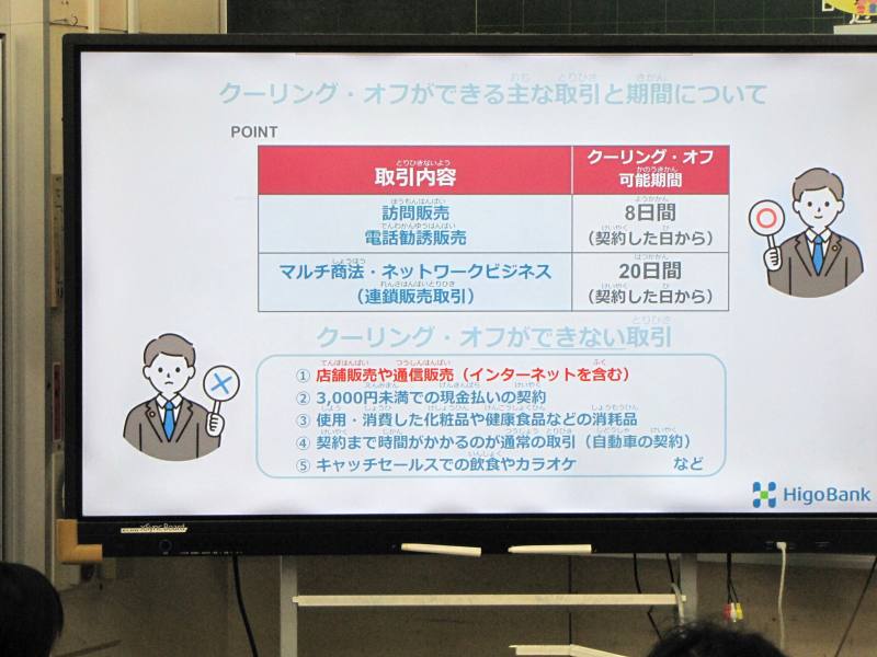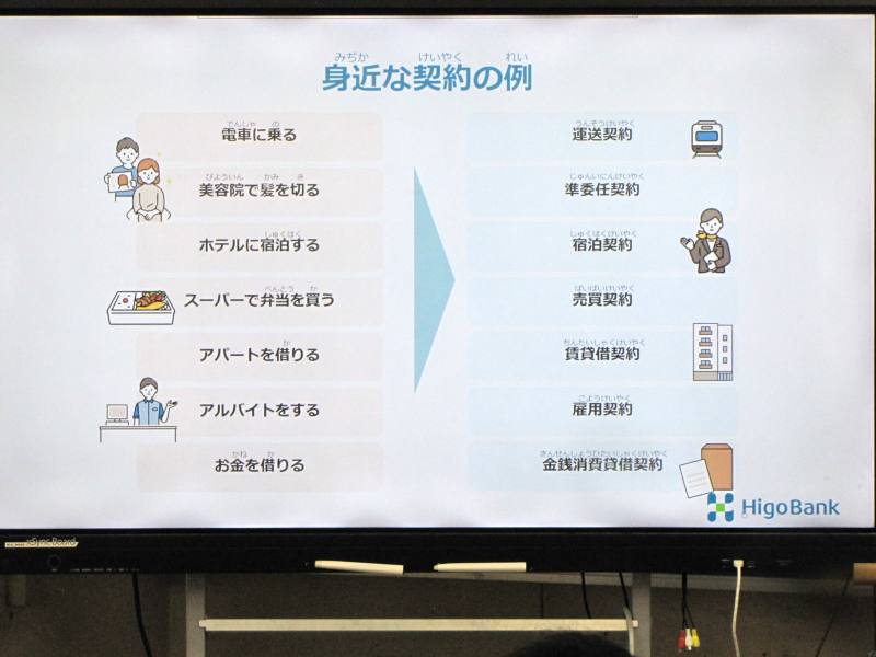 契約の意味、身近な契約の例、契約が成立するタイミング、契約書の種類、契約の時に発生する権利と義務、契約の取り消しができるパターン、クーリングオフ、インターネット上での契約と注意点、通販サイトの注意点など、クイズやグループディスカッションを通して多岐にわたって学びました。
