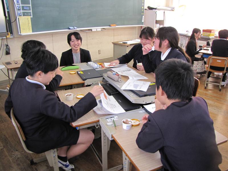 熊本の特産品であるスイカやミカンを使ったアイスクリームの商品開発をテーマに、商品名、キャッチコピー、使用した果物、工夫した点、販売期間、パッケージなどを、ワークシートに沿ってグループでディスカッションしました。