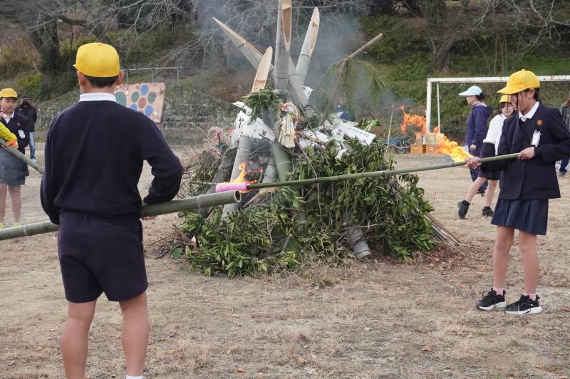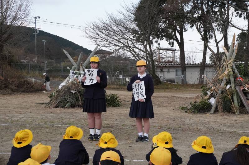 6年生が書道で書いた”今年の目標”をやぐらにくべ、手作りのトーチで点火し、燃え上がる炎に願いを込めました。