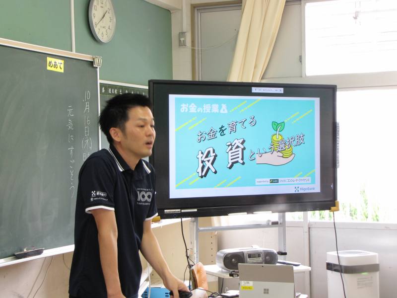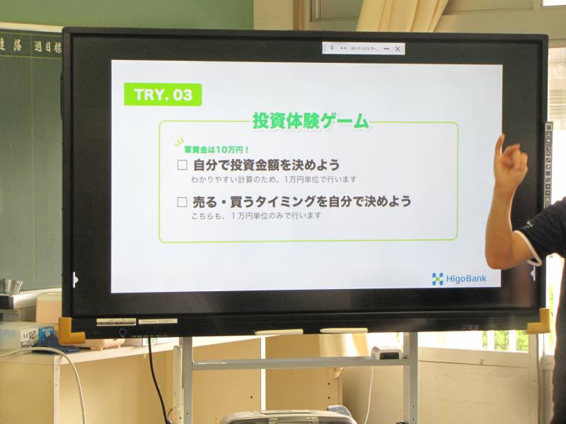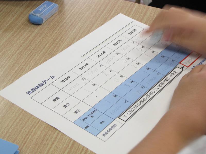 お金の使い方には「消費」「浪費」「貯金」のどれかに当てはまりますが、“お金を育てる”「投資」という選択肢もあるということで、手持ちの10万円を株式投資でいくら増やせたかのゲームを行いました。