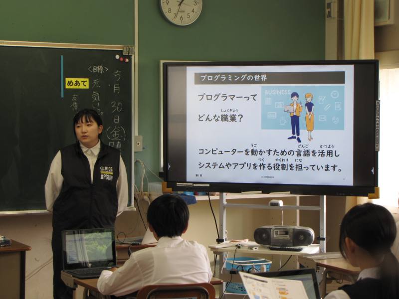5月30日に今年度の「プログラミング」授業が始まりました。中学1年生~2年生が来年3月まで11回に渡って学びます。今回は1年生の授業の様子を紹介します。