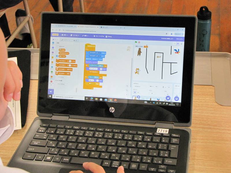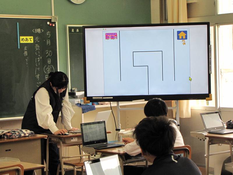 「迷路ゲームを作ろう」という課題が与えられ、設定された指示をプログラミングしていきました。昨年度半年間に渡って小学校で授業を行ったため、ほぼ時間内に終えることができました。