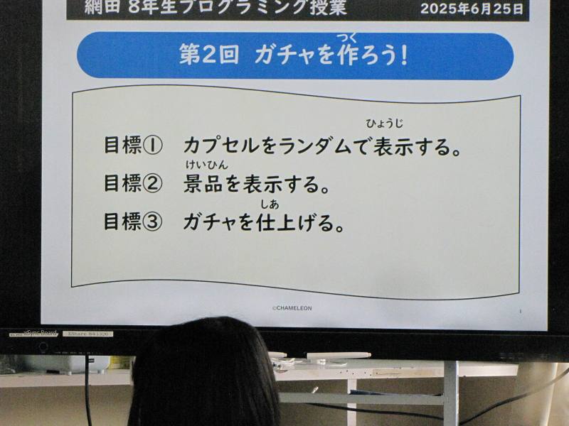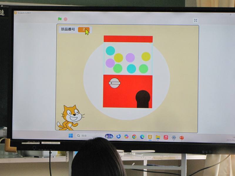 テーマは「ガチャを作ろう」で、先月に続き、ガチャマシーンづくりの2回目。カプセルをランダムで表示する、景品を表示する、初期化をしてガチャを仕上げる、といった流れで進んでいきました。