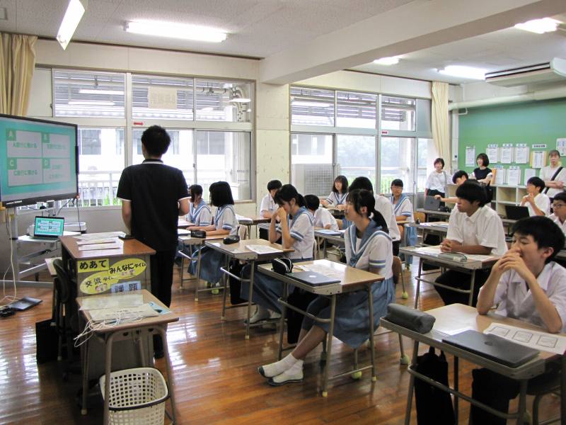 7月18日に2回目の「金融マーケティング」授業がありました。今回は2年生の授業の様子を紹介します。この日は、保護者への周知・啓発の機会として授業参観も併せて行われ、保護者の方も多数参加されました。