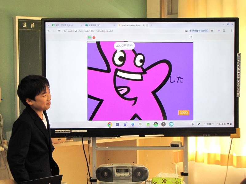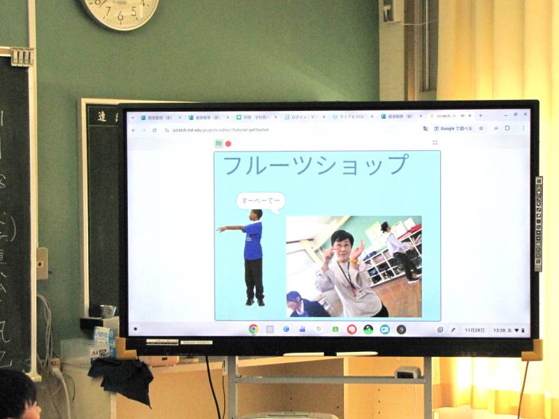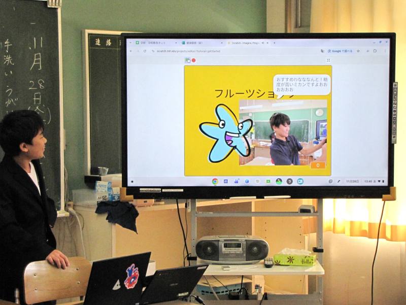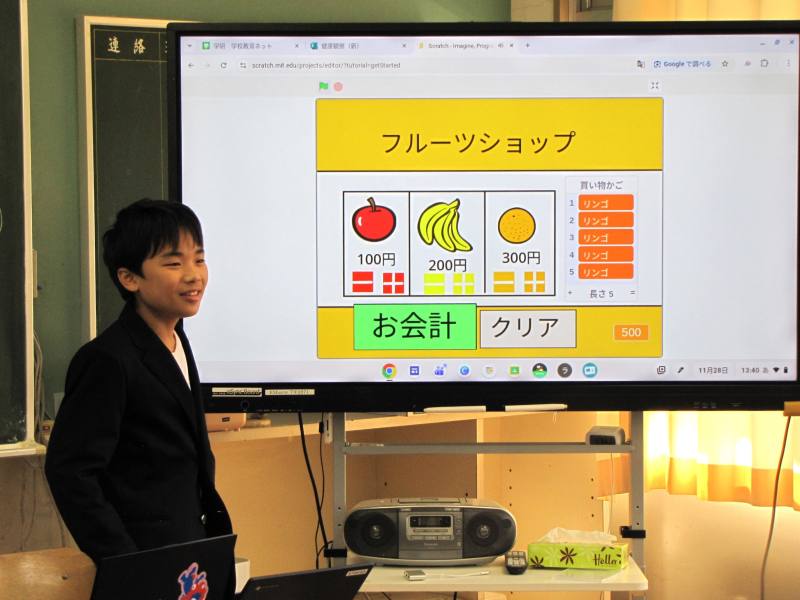 フルーツを買い物かごに入れ、会計に進むと店員が合計金額を伝えるという一連の流れがプログラムされ、生徒たちの成果が披露されました。